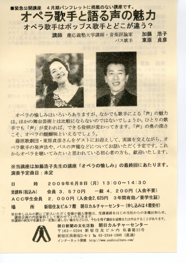 加藤浩子先生の朝日カルチャーセンターでの講座「オペラの愉しみ」の最終回は公開講座になっていて、受講生でなくても誰でも参加できます。今回はバス歌手の東原貞彦さんをゲストにお迎えして実演を交えながら、発声法やバスの声種などについてのお話が聞ける楽しいものでした♪
