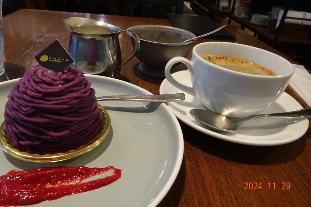 色々な建物からの感動を抱きながら、帰りはまっすぐ帰る気にもならず、ちょっと贅沢な”鹿児島産の紫いものモンブランに、有機栽培の珈琲のセットを楽しんで帰った。