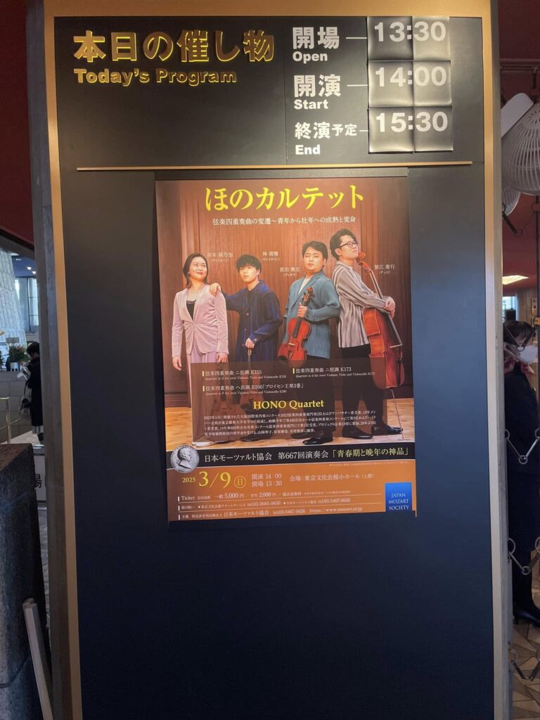 今、若手の期待の弦楽四重奏団「ほのカルテット」の演奏を楽しみました。全員芸大出身者で結成され、数々の賞を既に結成早々から受賞している。