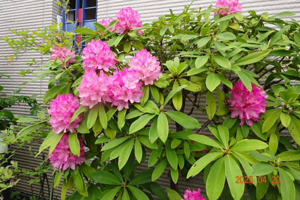 お隣さんの玄関わきの小さな植え込みに植えられているシャクヤクが、今綺麗に咲いています。