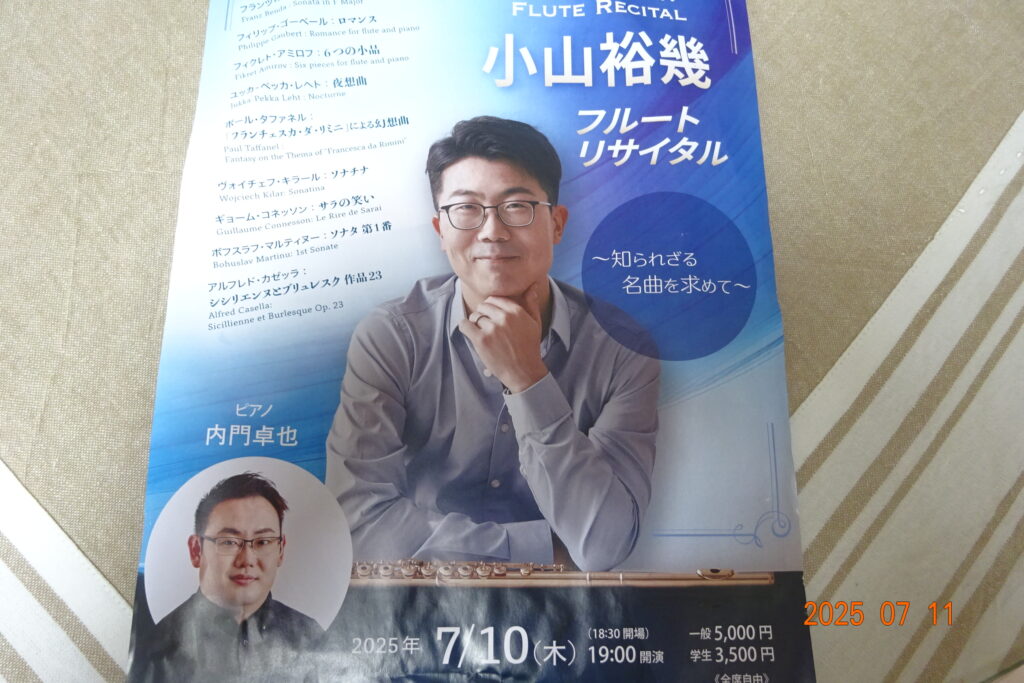昨晩私は19時開演のルーテル市ヶ谷ホールで「小山裕幾フルートリサイタル」を聴きに出かけていた。JR市ヶ谷駅に着いたのが、18時半頃だが激しい雷雨で外に出られない。30分ほど待っていても稲光に雷雨は止まず開演時間になってしまった。
