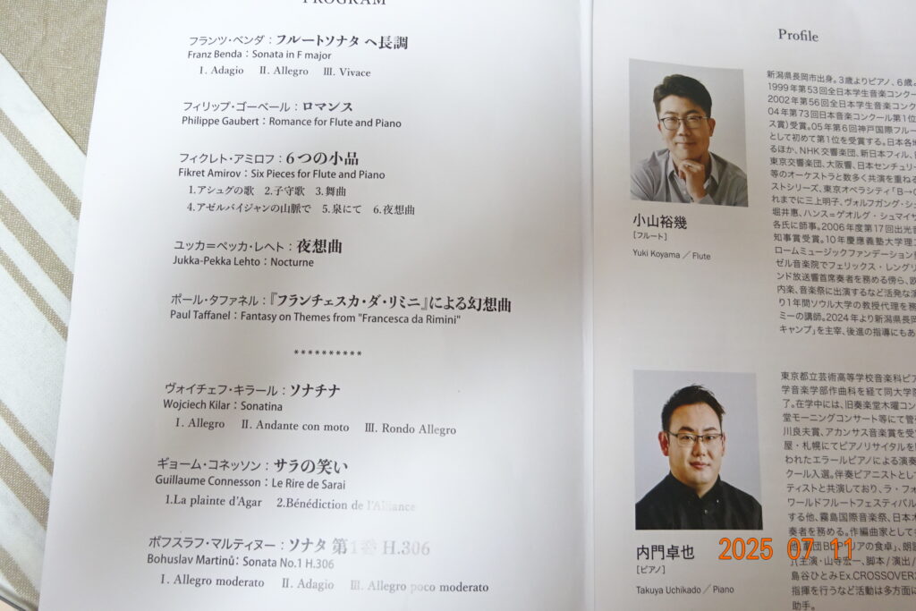 フィンランド放送交響楽団に入団して早や11年、充実した生活ながら、どこか物足りなさを感じるようになった、それは自分自身を表現する機会があまりにも少ないこと。かつては、ゴールウェイ、ランパル、ニコレ、ラリューといった素晴らしい個性を持つフルーテイスト達が来日し、フルート界のみならず、音楽界全体を大いに盛り上げていたのに・・そんな思いから自らが音楽会を企画し、発信していく必要があると決意したと、ご挨拶にはそう書いてあった。